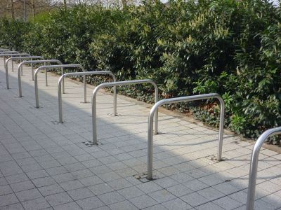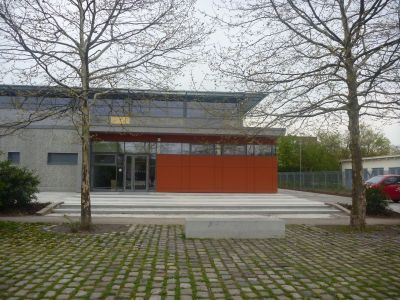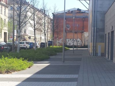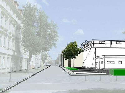 Die historische Bauflucht an der Konradstraße wird durch eine Baumreihe markiert. Im Gehwegbelag wurde das Streifenmotiv aus dem Freizeitpark aufgenommen. Zur Sporthalle gehört ein Parkplatz mit 29 Stellplätzen.