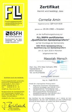 Als nach DIN SPEC 79161 qualifizierte Spielplatzprüferin führe ich die Abnahme von von neu errichteten Spielanlagen sowie auch die erforderlichen regelmäßigen Kontrollen durch.