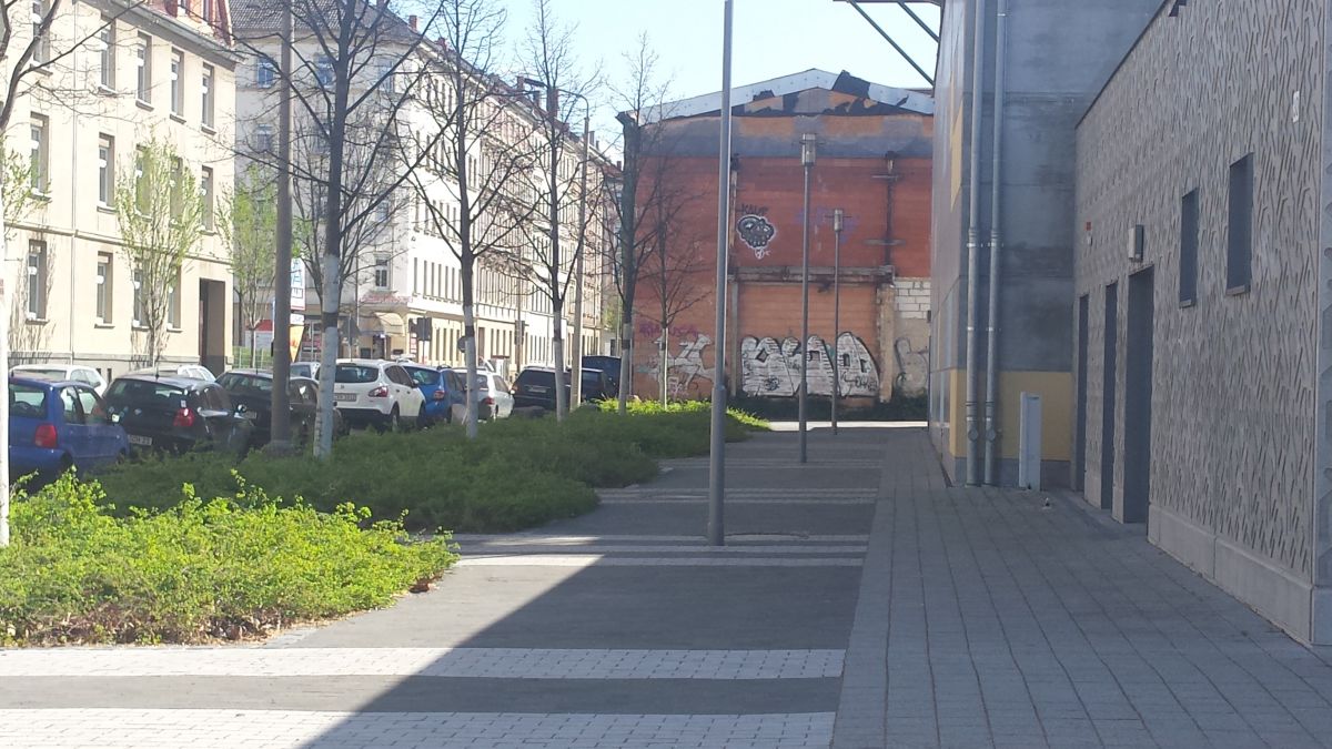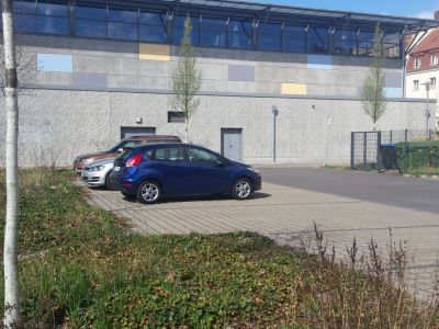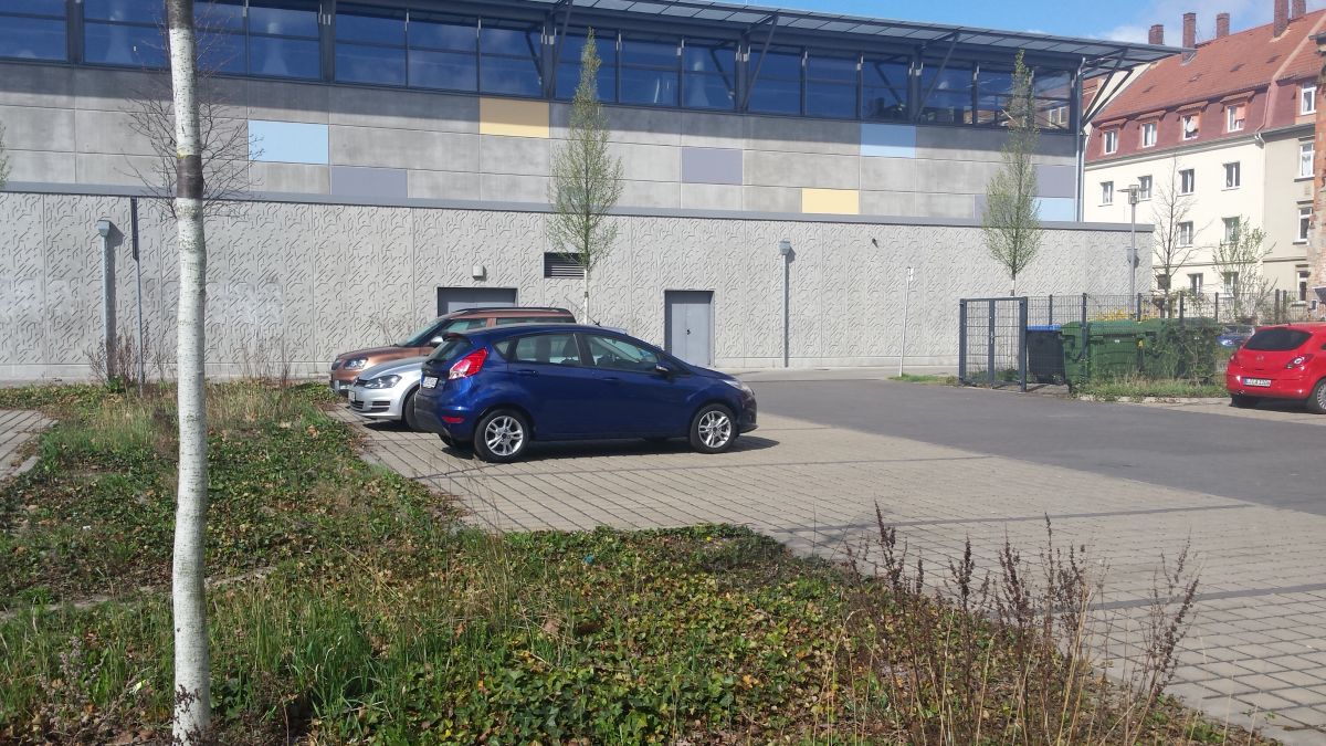 Die historische Bauflucht an der Konradstraße wird durch eine Baumreihe markiert. Im Gehwegbelag wurde das Streifenmotiv aus dem Freizeitpark aufgenommen. Zur Sporthalle gehört ein Parkplatz mit 29 Stellplätzen.